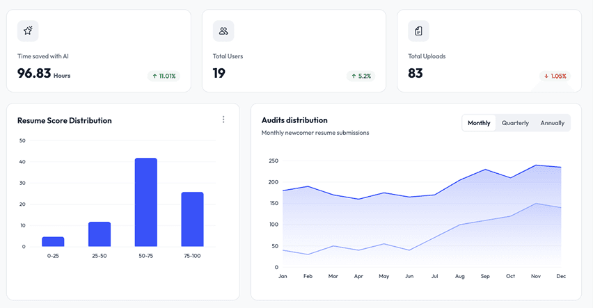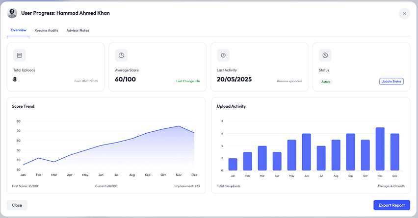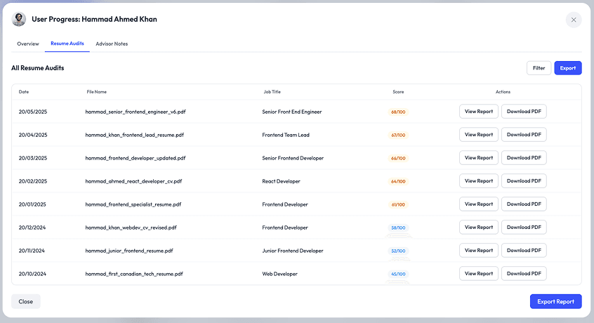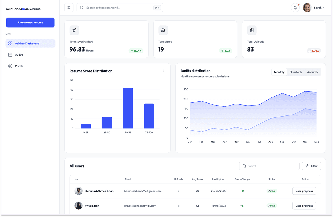 The platform automatically calculates advisor time saved (75-> 7 minutes per resume), improvement in resume scores (18% -> 93% Canadian fit), and key metrics for IRCC reporting. Export custom reports to prove impact to government and corporate funders without additional admin burden.