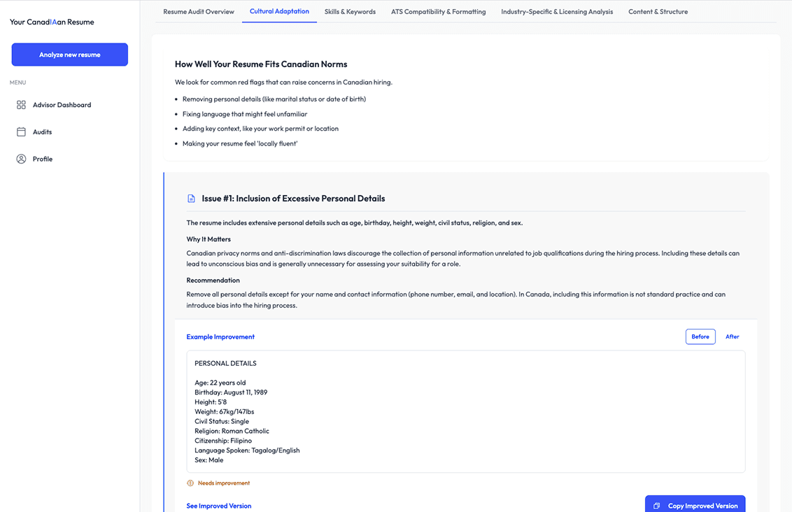 One newcomer client had 'Curriculum Vitae' at the top of his resume and included his photo – standard in his home country, but a red flag for Canadian recruiters. We helped him reformat to Canadian standards, and he immediately started getting interview calls