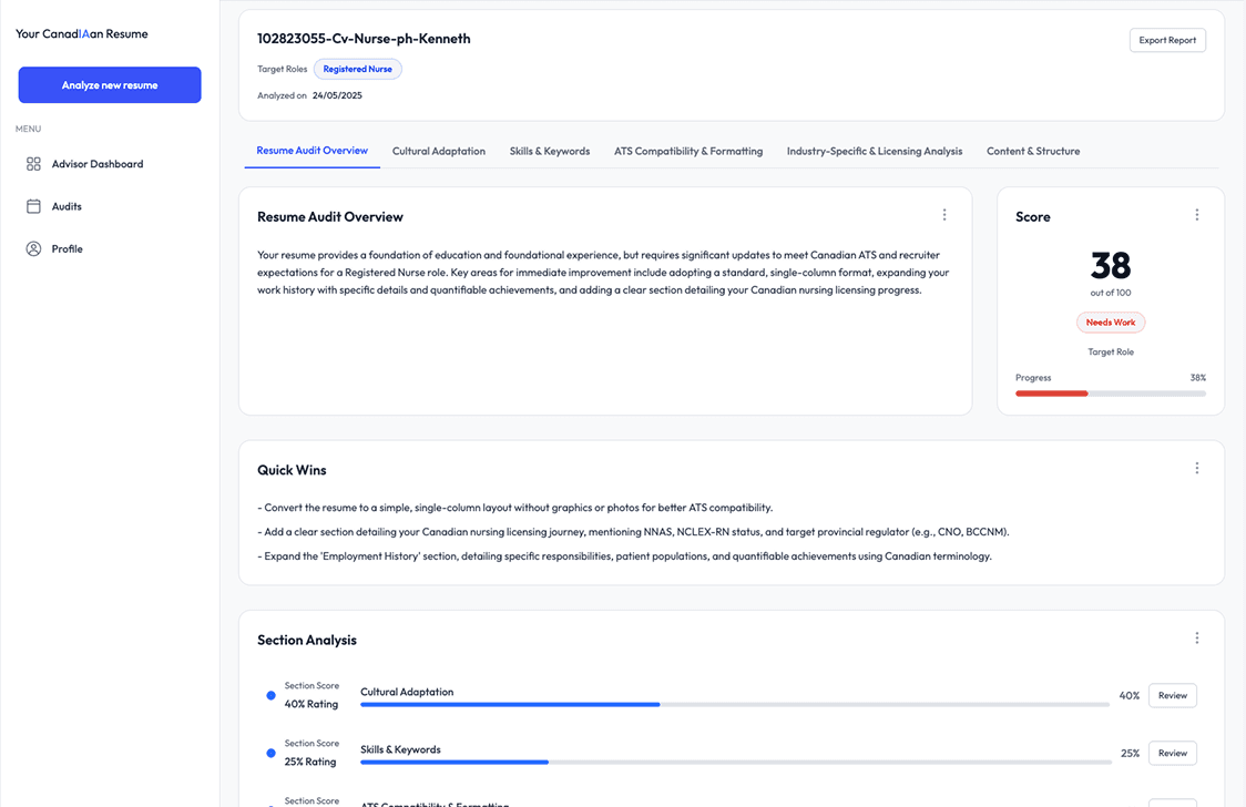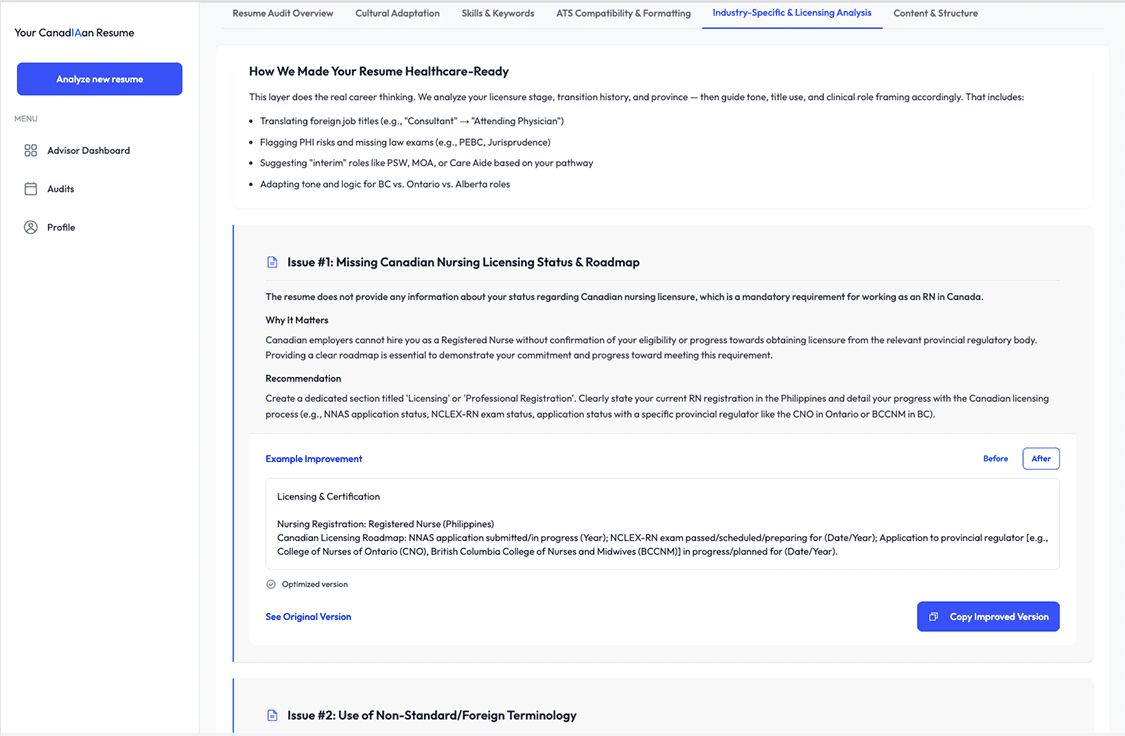 Unlike generic AI that provides broad suggestions, our system understands specific Canadian employment contexts and regulatory pathways. For each industry in Canada, we've trained our AI on hundreds of pages of licensing requirements, coded provincial differences, recruiters' requirements, immigrant success stories, etc.